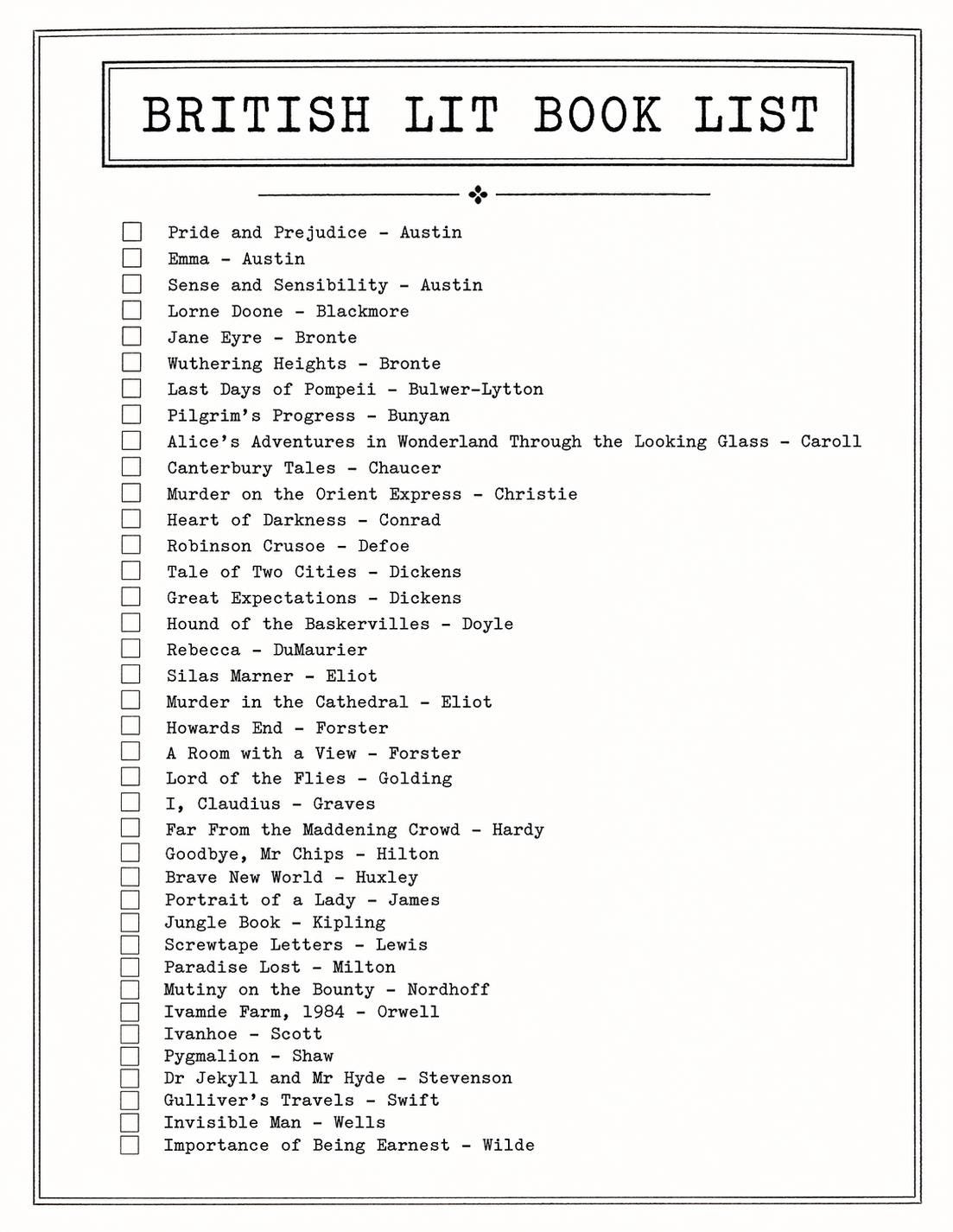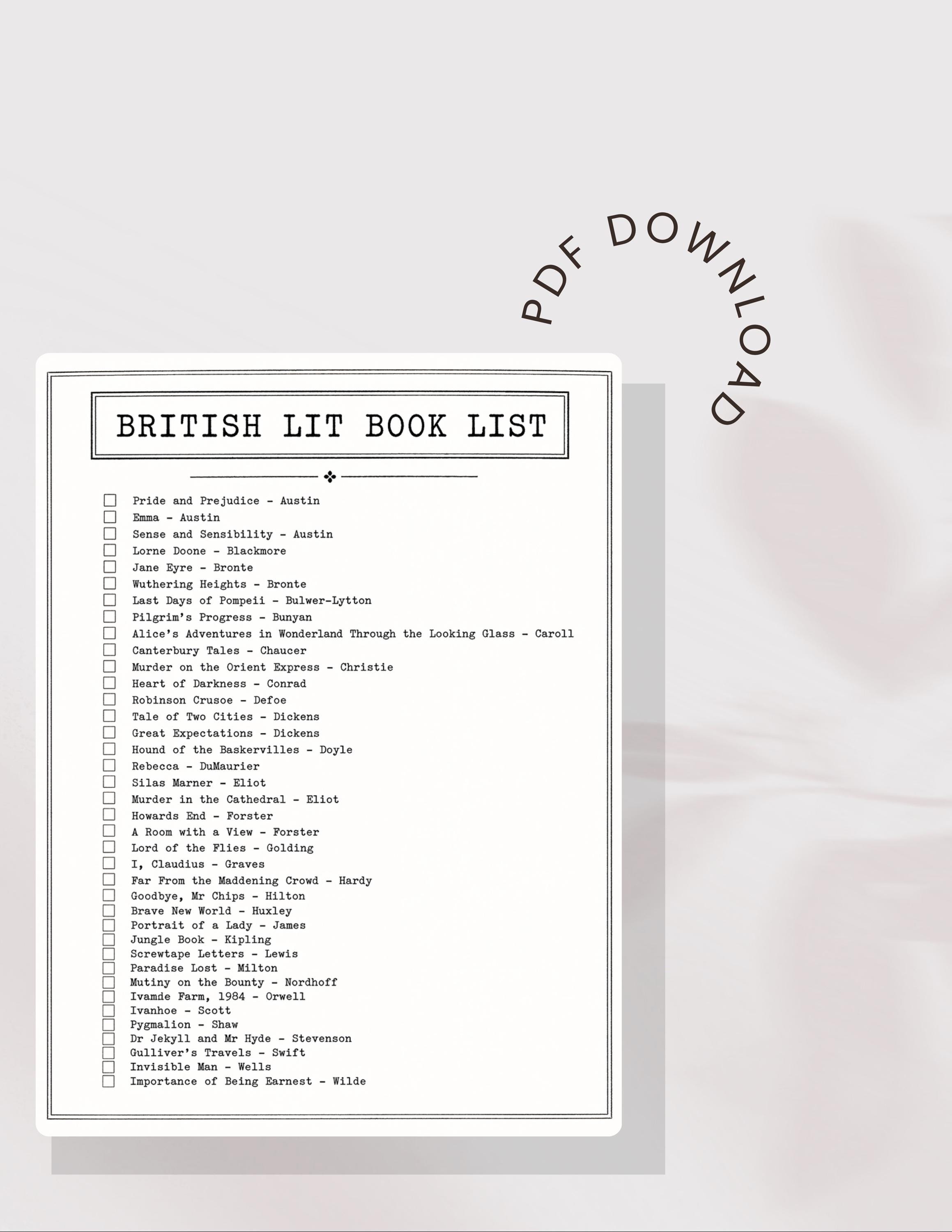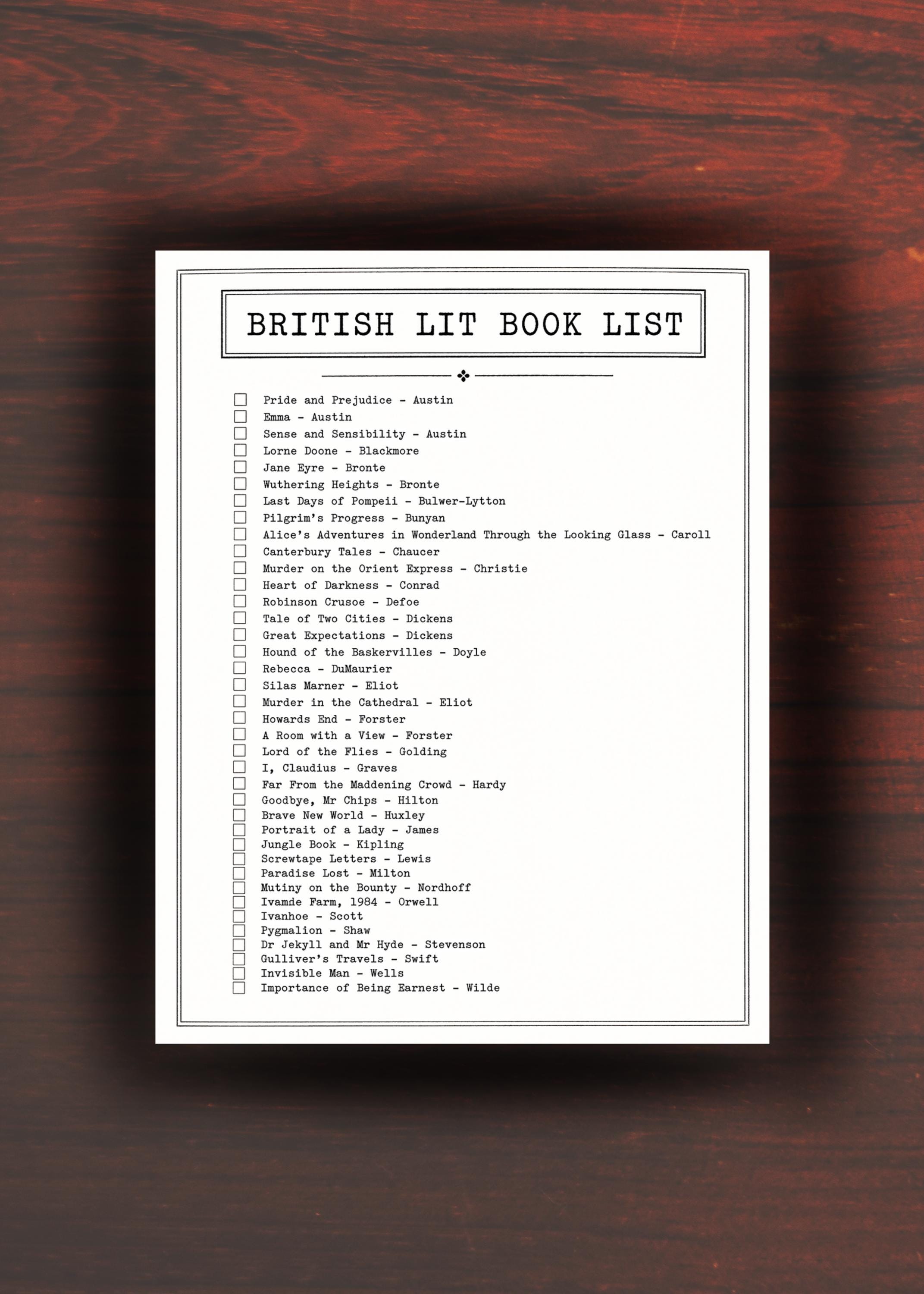 A curated list of great works in British literature, spanning different eras, styles, and themes—ideal for teachers, homeschool moms, or lovers of literature.