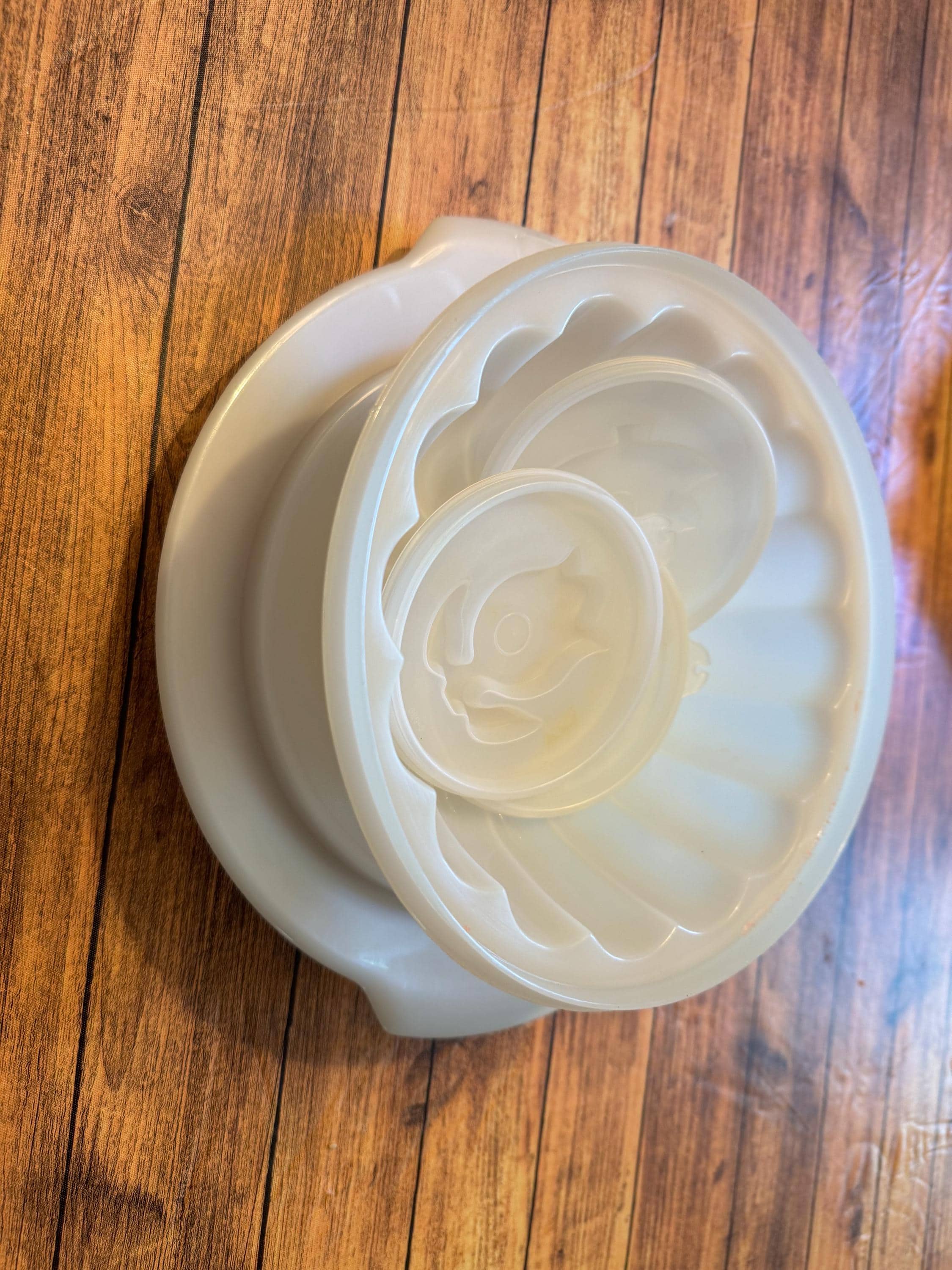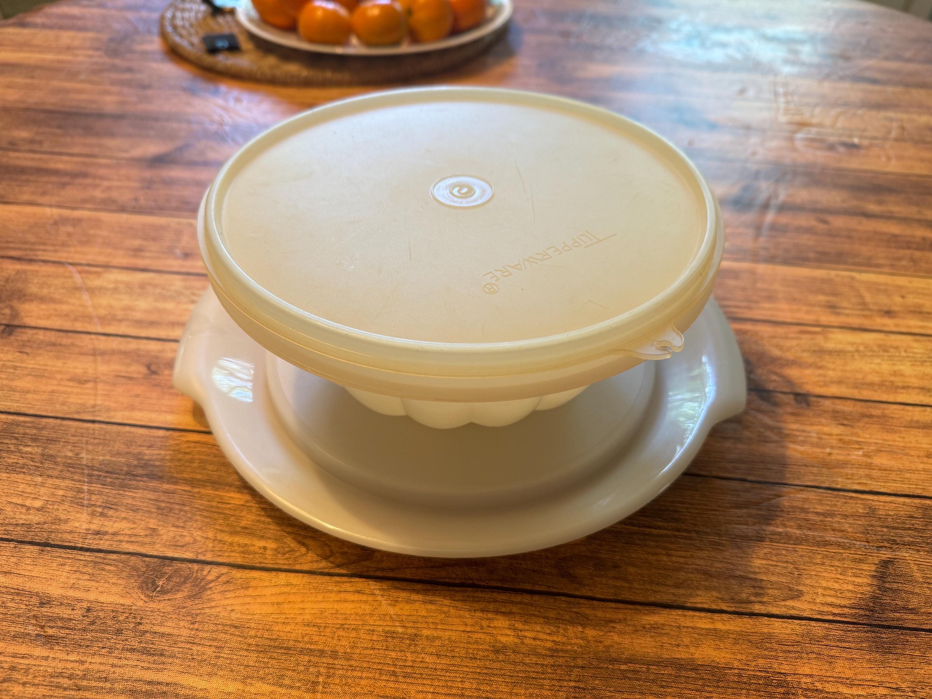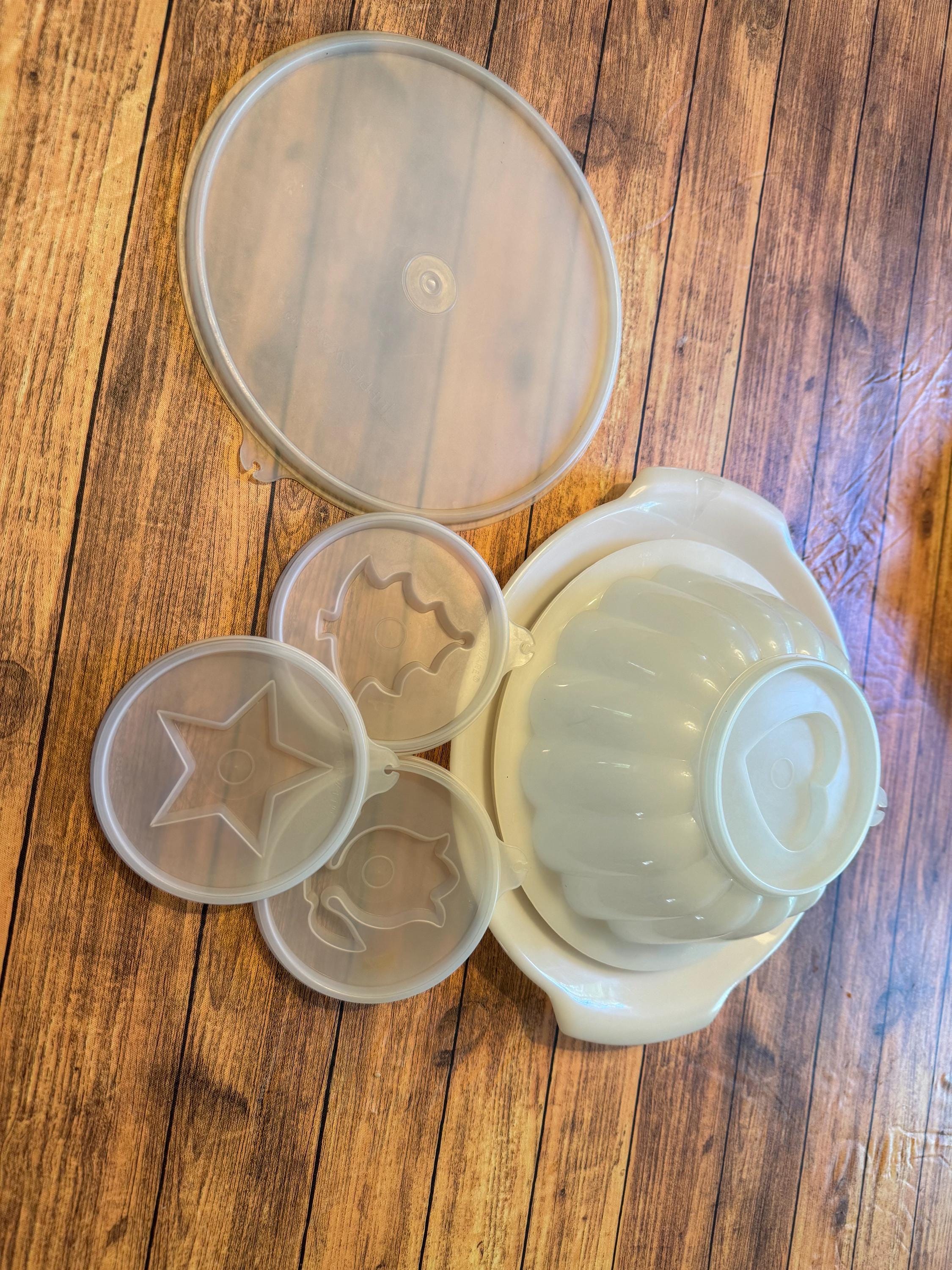 A set of Jel-N-Serve Tupperware jello mold. The Jello mold, known as the Jel-N-Serve, was first introduced in the 1960 by Tupperware. It became popular during that decade and was featured in Tupperware catalogs at least through the 1970s.