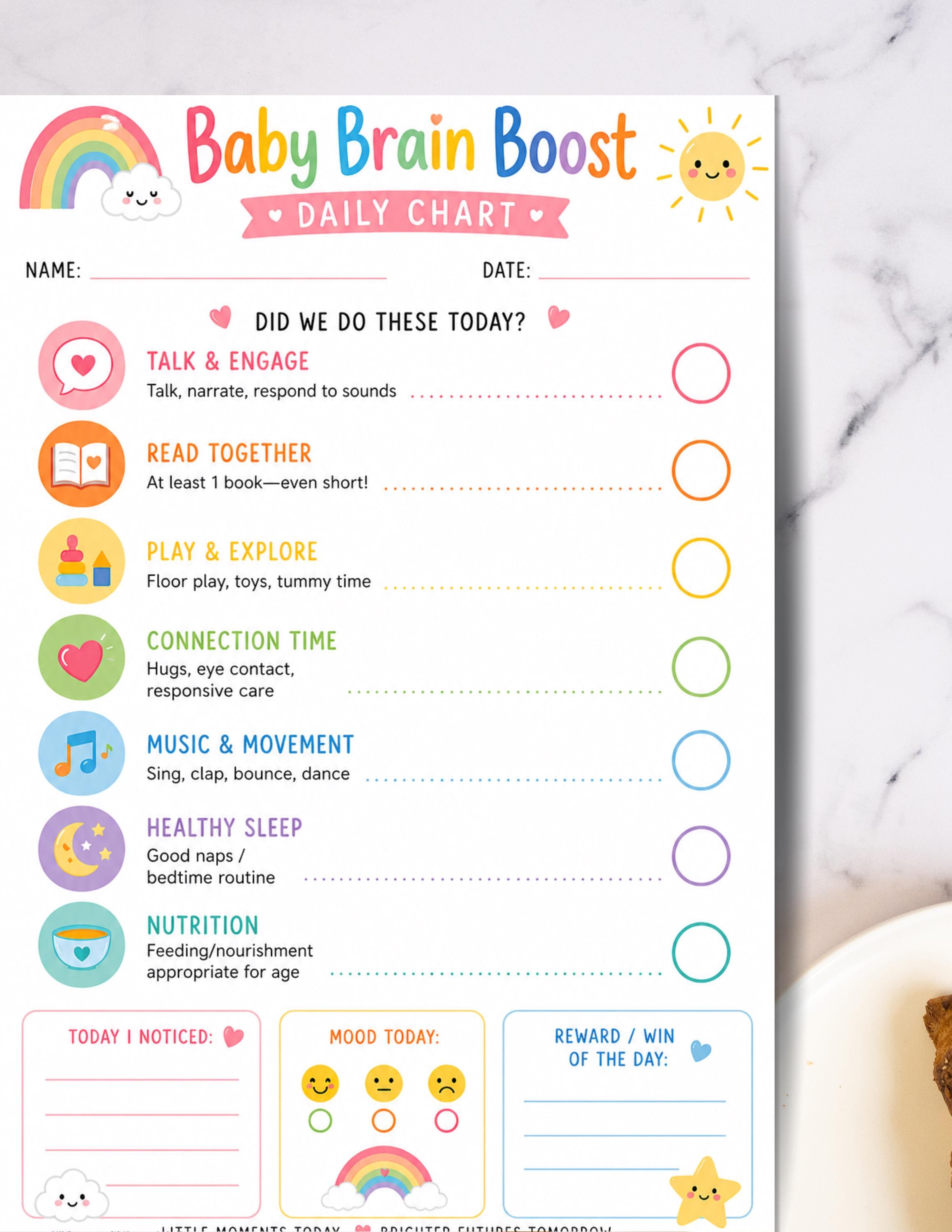 A simple, visual daily checklist that helps parents build strong early learning habits through talking, reading, play, and connection. Designed with soft rainbow icons and an easy-to-use layout, it makes supporting your baby’s development feel effortless and joyful.