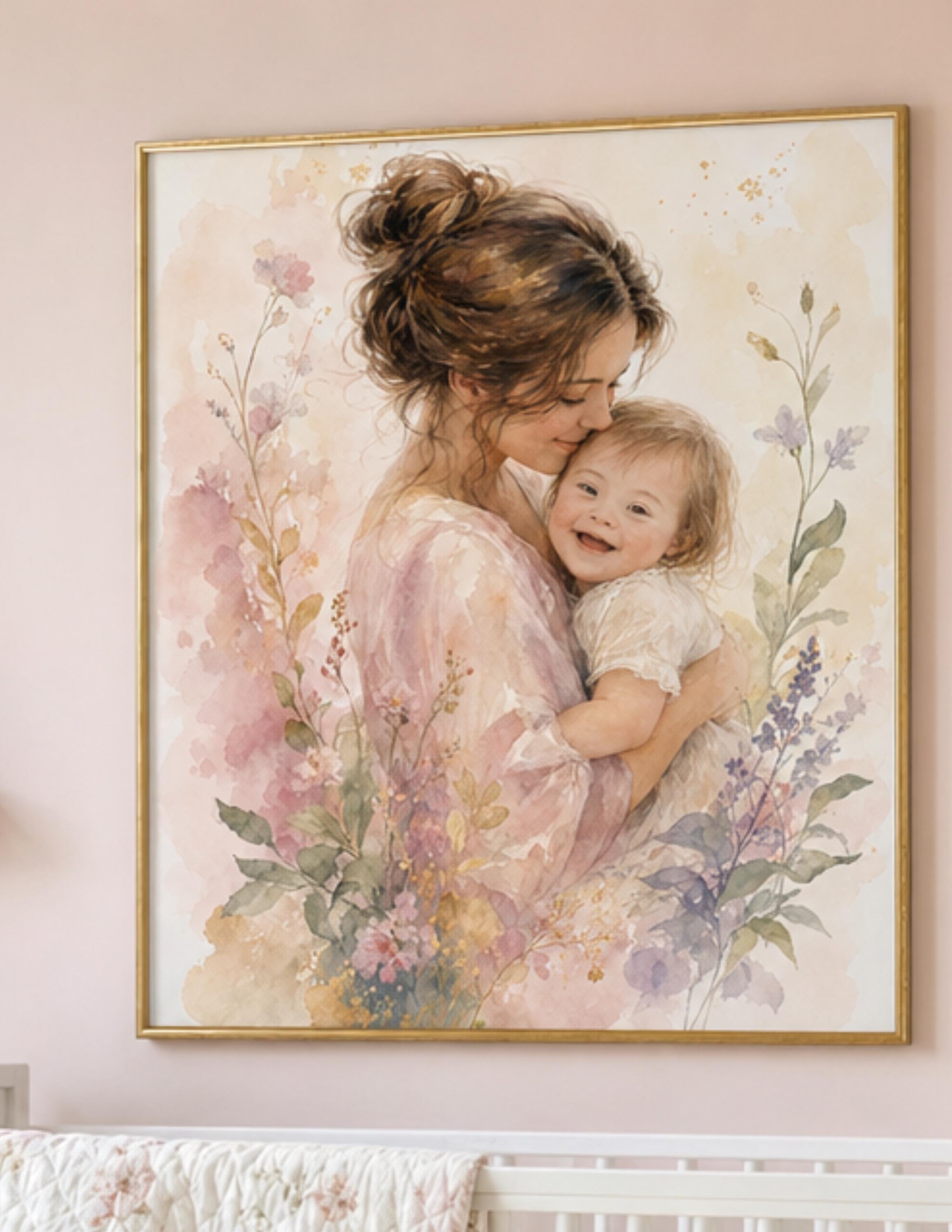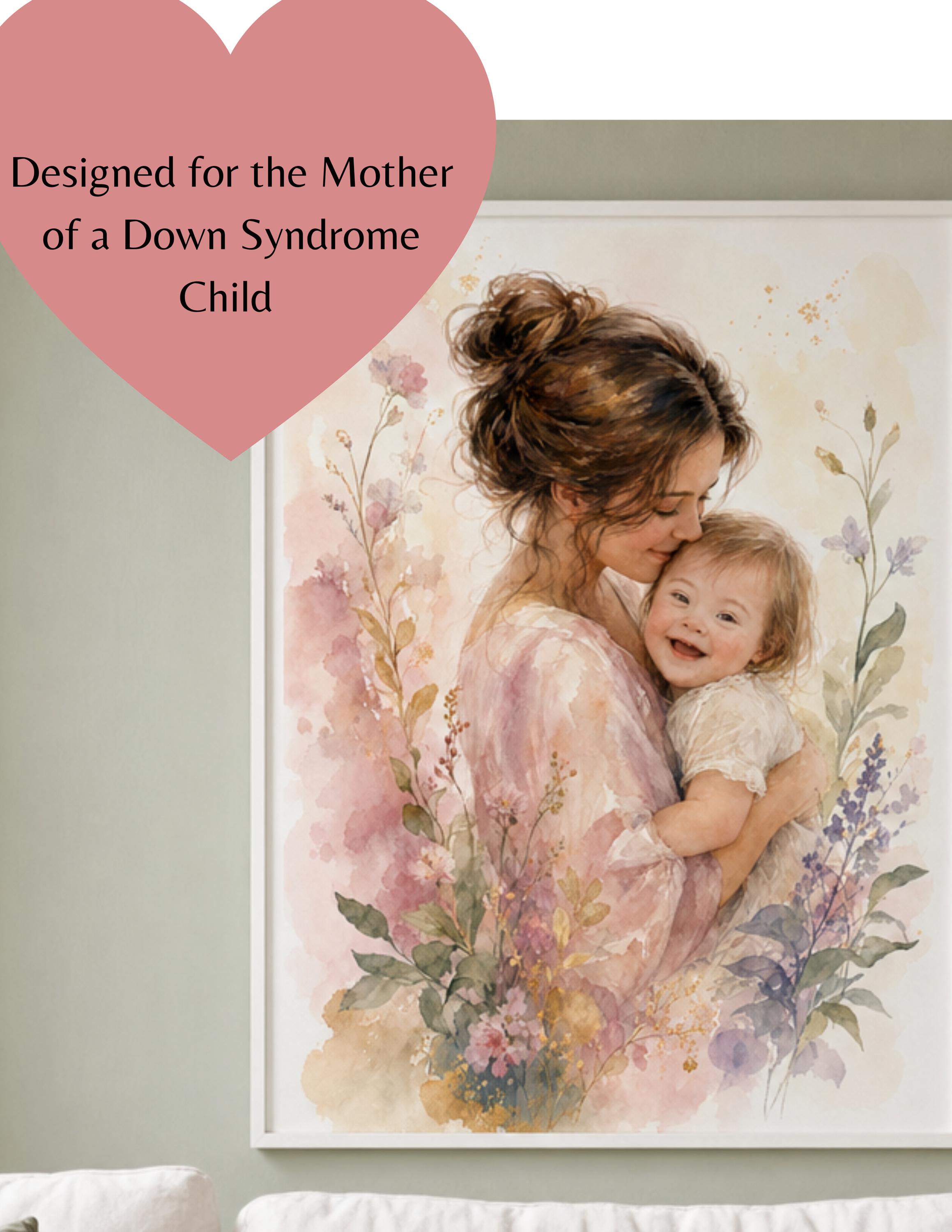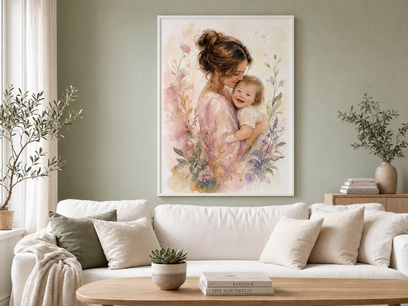 A dreamy watercolor portrait of a mother lovingly embracing her smiling child with Down Syndrome, surrounded by soft blush, lavender, and sage botanical florals. Warm, luminous, and full of heart — this piece brings beauty and meaning to any living space. Instant digital download in three sizes: 8×10", 11×14", and 16×20".