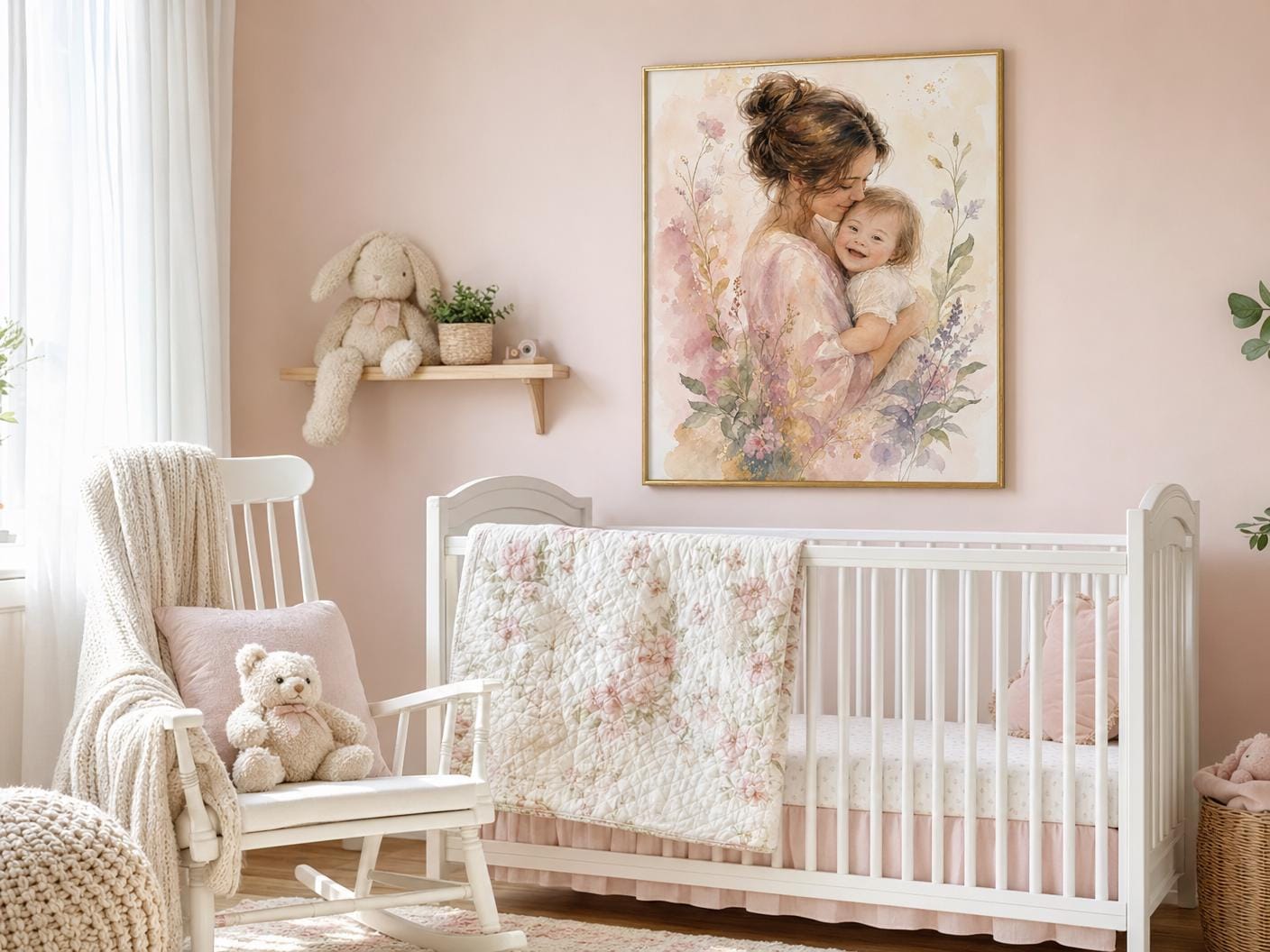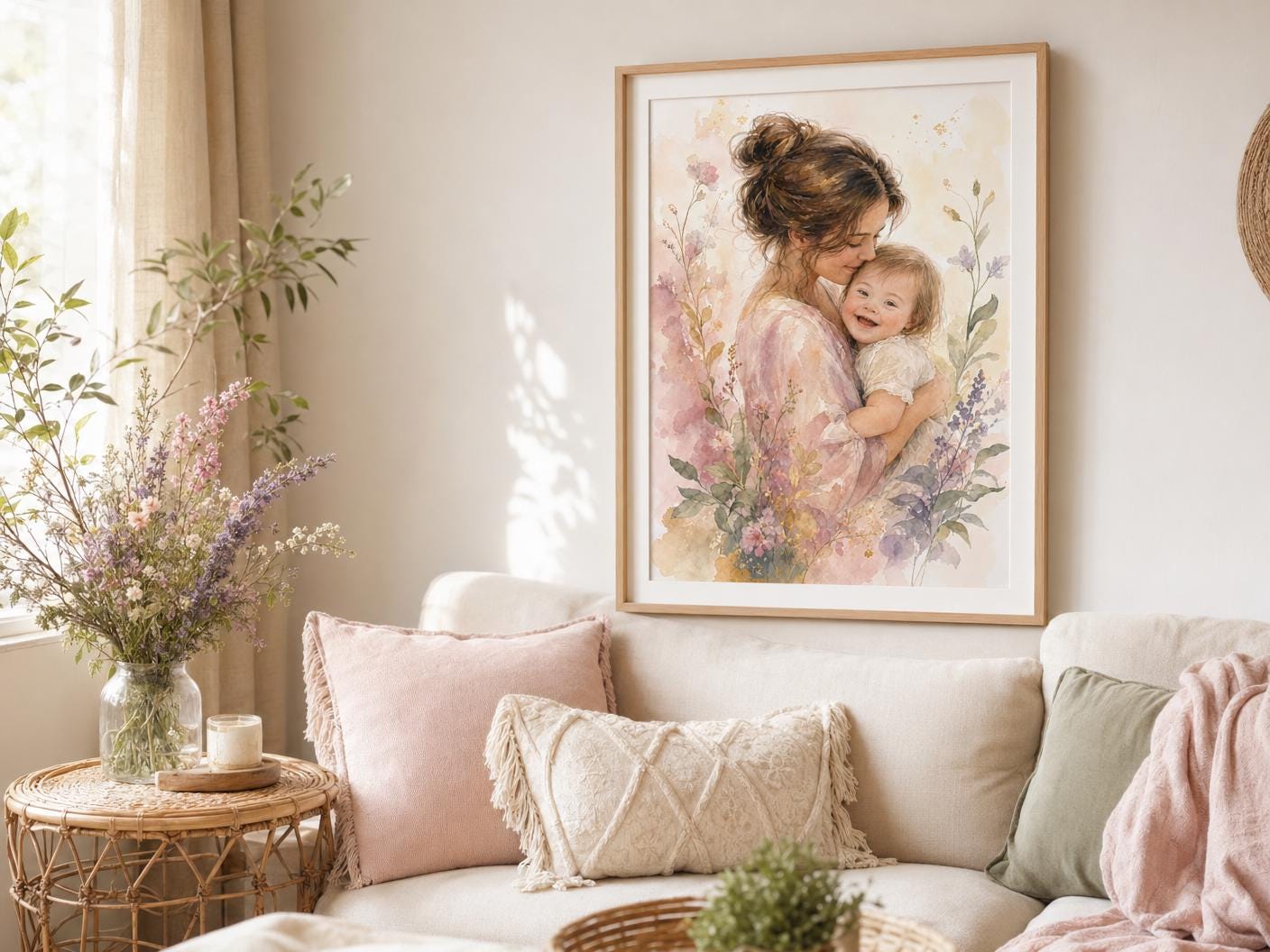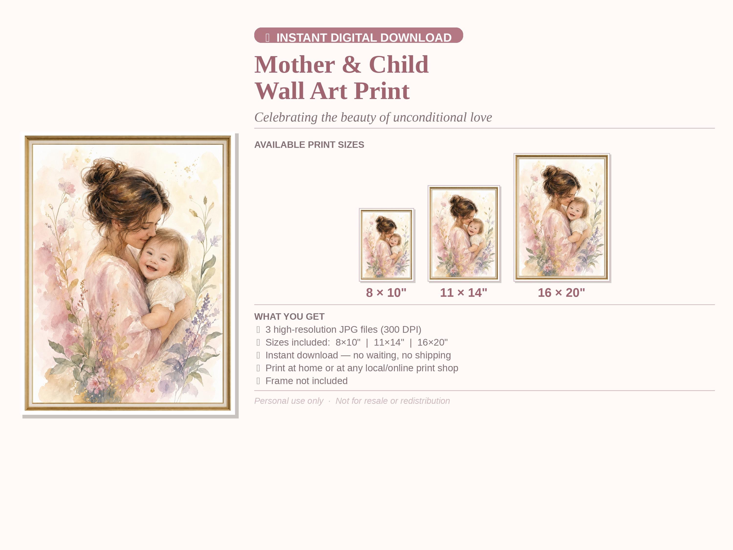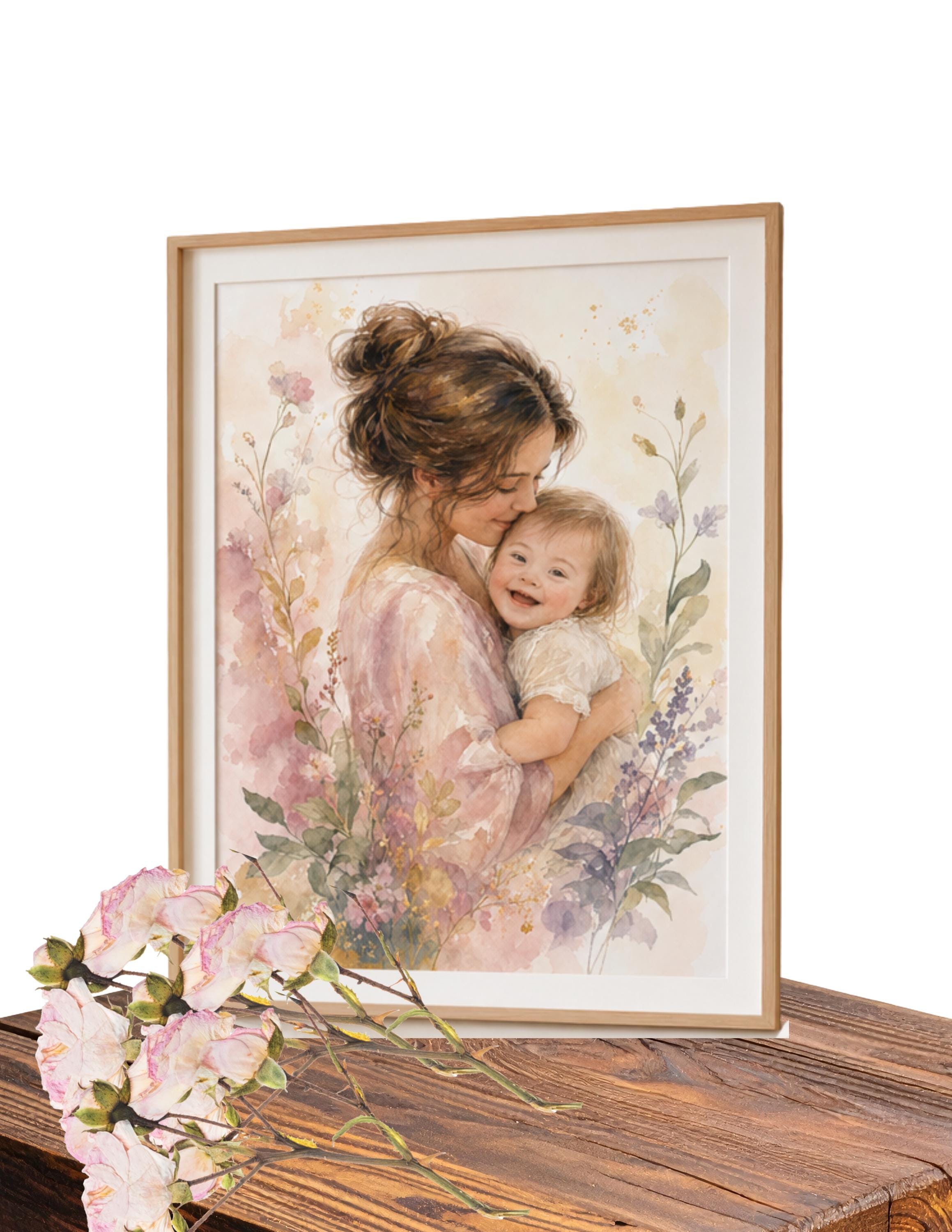 A dreamy watercolor portrait of a mother lovingly embracing her smiling child with Down Syndrome, surrounded by soft blush, lavender, and sage botanical florals. Warm, luminous, and full of heart — this piece brings beauty and meaning to any living space. Instant digital download in three sizes: 8×10", 11×14", and 16×20".