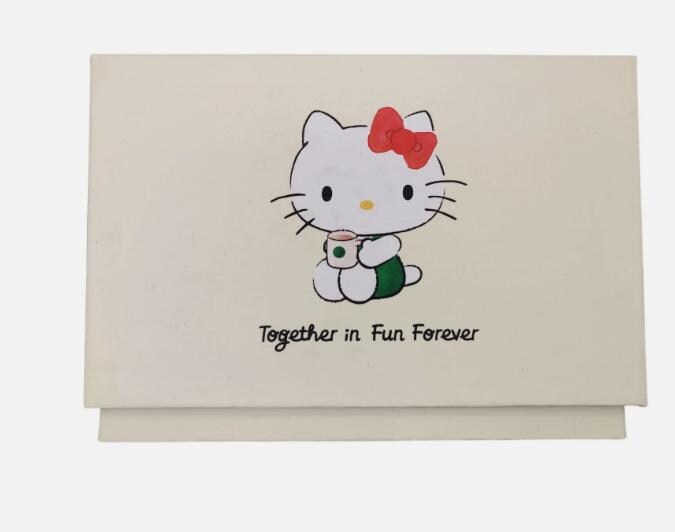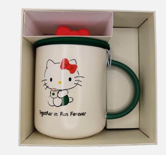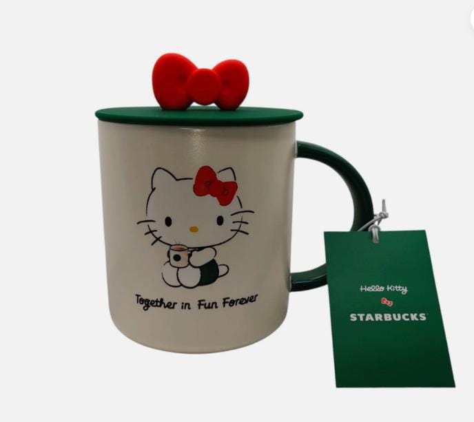 Highly sought after is the collectible Hello Kitty x Starbucks 2025 ceramic mug. It features HK dressed up as a barista and holding a cup of coffee on front. The words "Together in Fun Forever" are displayed in black font below. It's designed with a green lid and a signature HK red bow topper. A must-have for any Hello Kitty or Starbucks enthusiasts. A perfect gift for either. It's limited edition and collectible.